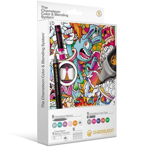 Chameleon Color & Blending System #5 Contains:6 Chameleon MarkersBG1 Lagoon, BG3 Turquoise, VO2 Mauve, PK3 Bubble Gum, OR3 Tangerine, CB Colorless Blender.